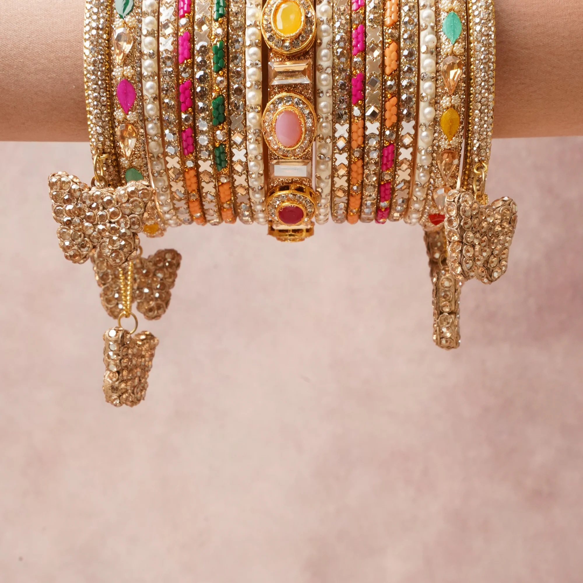 Featuring a striking composition of Gold-toned metal, Cubi.c Zirconia, Pearls, Synthetic Ruby, Synthetic Emerald, Synthetic Yellow Sapphire, Synthetic Rose Quartz, Glass, Enamel, Resin, this set carries intricate craftsmanship and strong presence. Grand in form, it is created for moments that deserve to be marked.