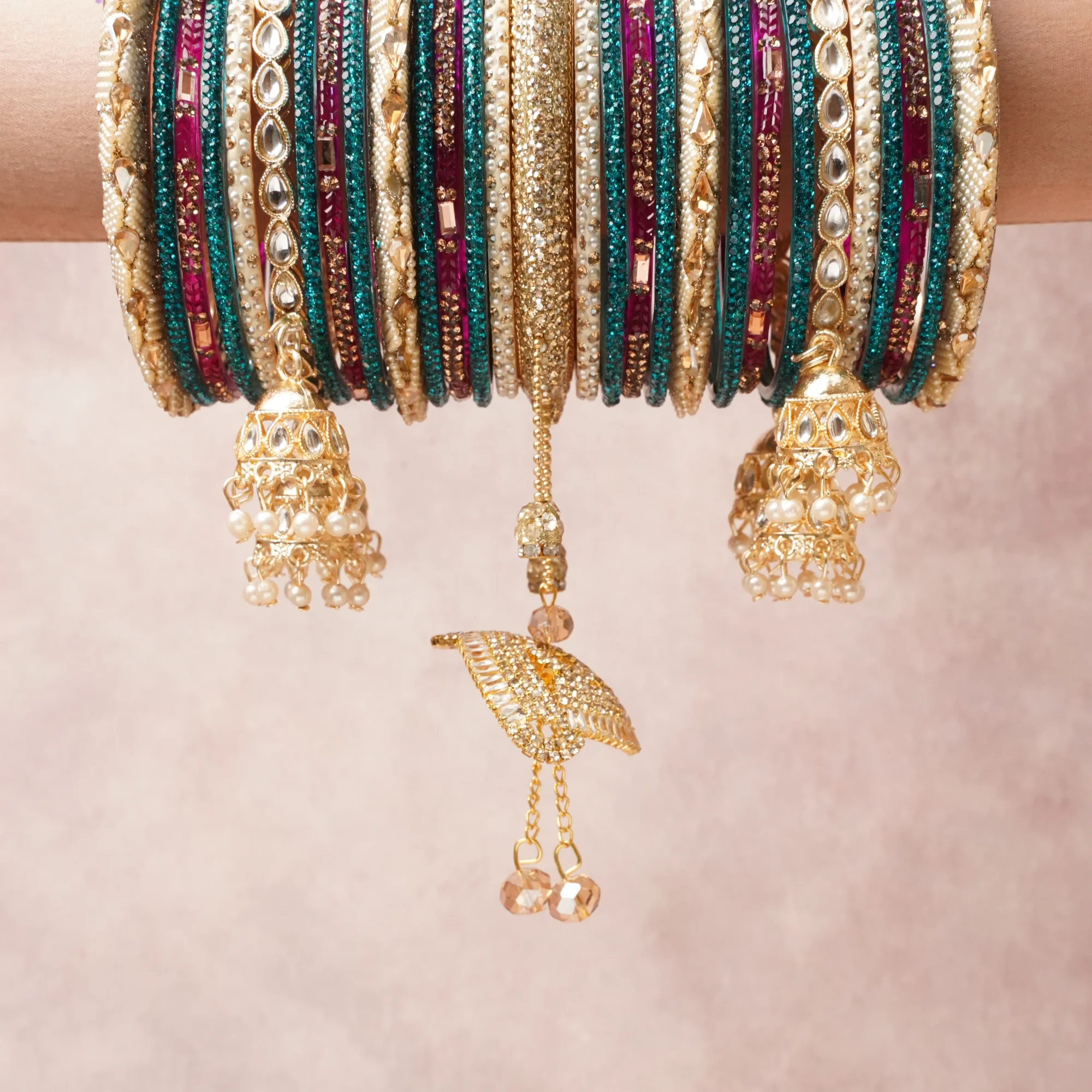 The Femminari Crown- Jewellery beyond luxury. A crown colour Deep Teal set, complemented by Cream, Clear Crystal, Sparkling Gold, featuring Gold-toned Metal, Simulated Pearls, Glass, Kundan Stones, Rhinestones, Crystal. A treat for the eyes, hands an.d heart- absolutely unforgettable.