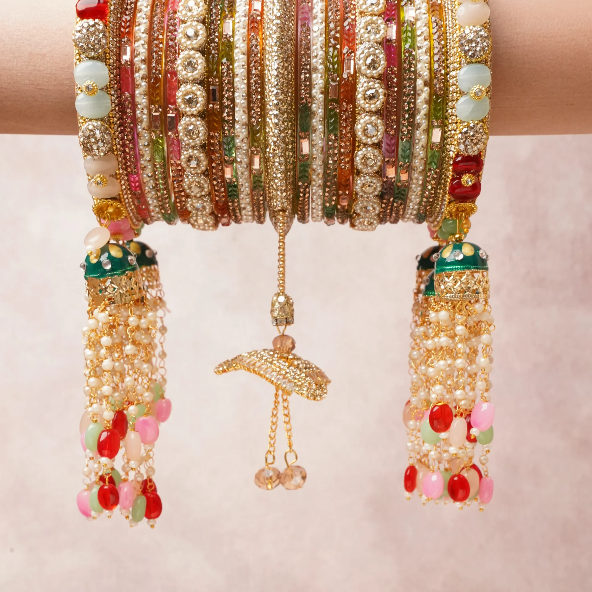 The Femminari Crown- Jewellery beyond luxury. A crown colour Gold set, complemented by Golden, Clear, White, Pink, Red, Green, Aqua, Peach, Orange, Purple, Multi colour, featuring Gold-toned Metal, Rhinestones, Faux Pearls, Glass, Enamel, Gemstone Be.ads. A treat for the eyes, hands and heart- absolutely unforgettable.