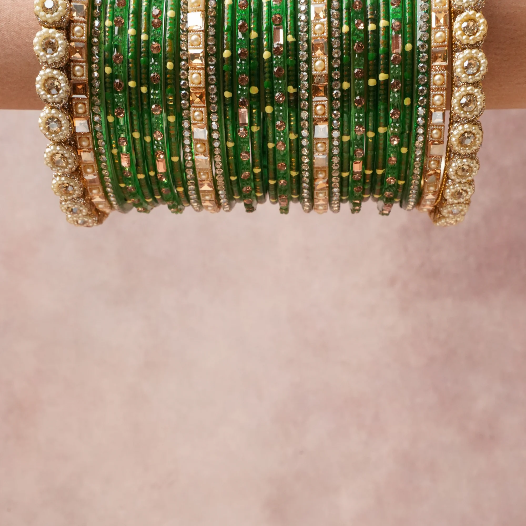 A grounding Emerald Green forms the heart of the set, while touches of Gold, Ivory, Clear, Rose Pink, Chartreuse add charm.